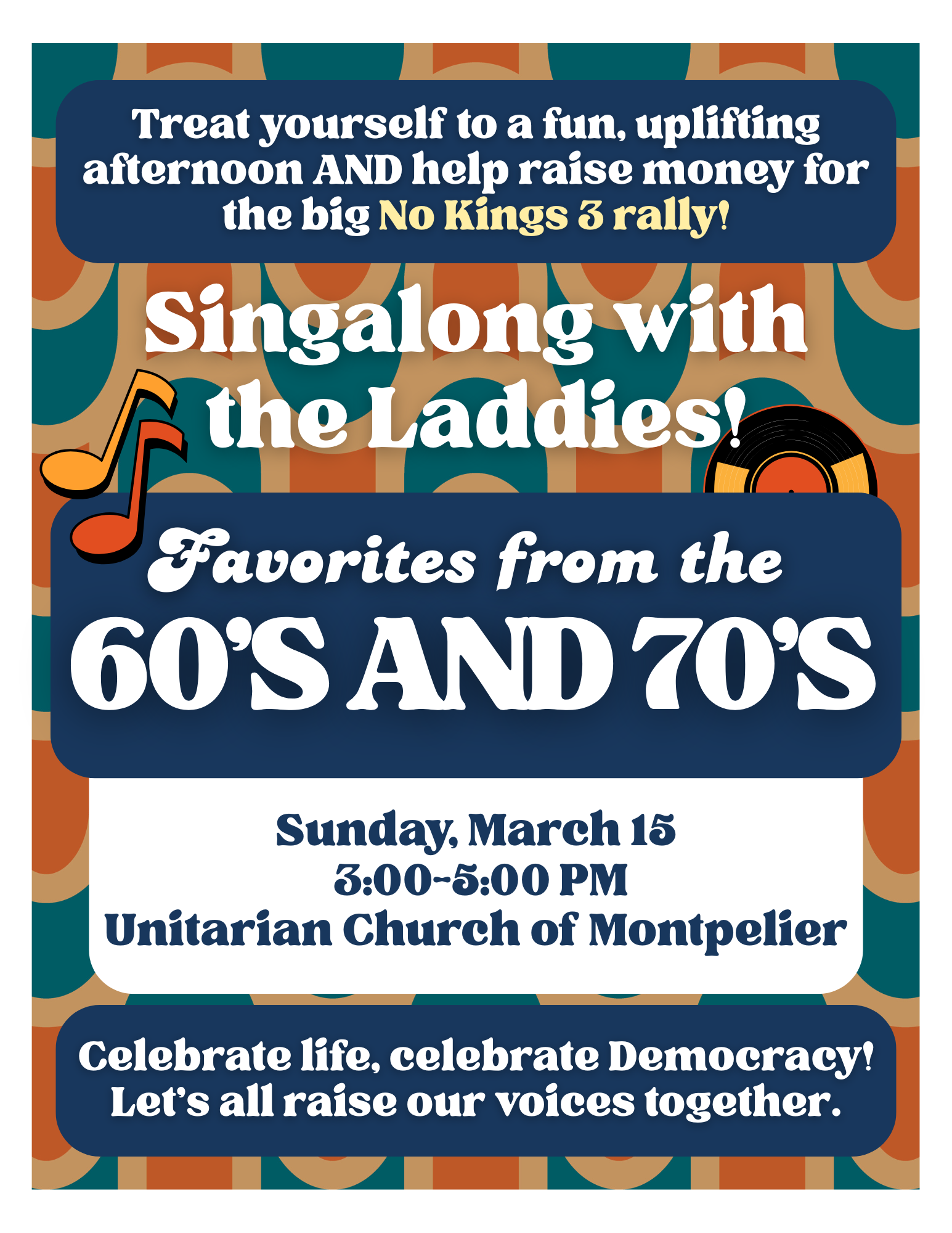 Treat yourself to a fun, uplifting afternoon AND help raise money for the big No Kings 3 rally! Singalong with the Laddies, favorites from the 60s and 70s, Sunday, March 15, 3 to 5 PM at the Unitarian Church of Montpelier. Donations at the door. Celebrate life, celebrate Democracy! Let's all raise our voices together.